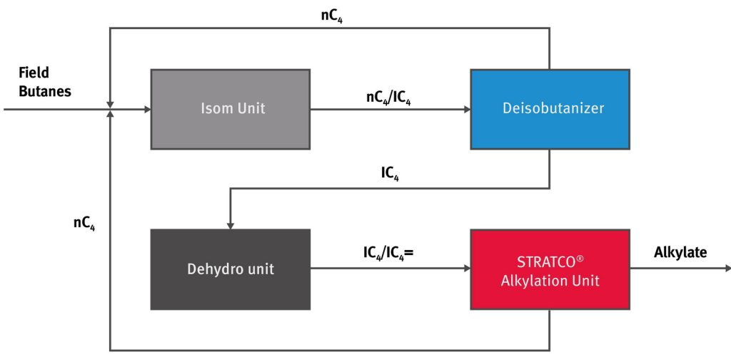 A traditional butane-to-alkylate complex consists of field butanes that are isomerized to form isobutane. This isobutane is then sent to a dehydrogenation unit to create isobutylene. The isobutylene serves as the primary olefin feed stock to the STRATCO® sulfuric acid alkylation unit.