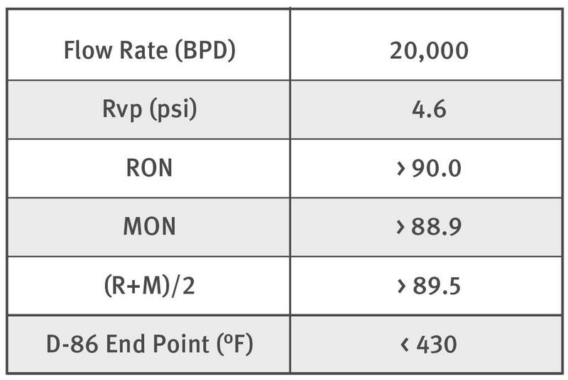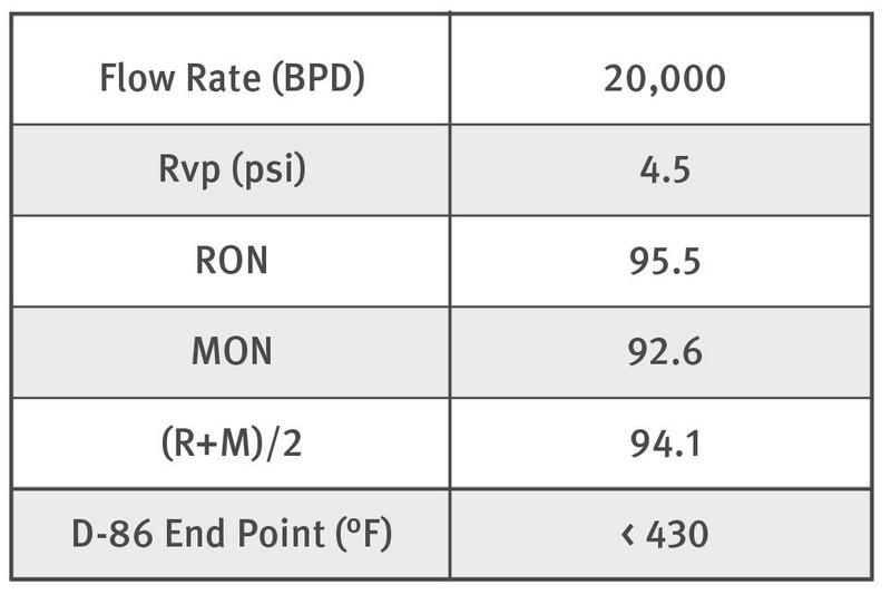 Using typical operating conditions for this type of complex, it is estimated that a feedstock of 25,500 BPD of field butanes will yield 20,000 BPD of high quality alkylate with a RON of approximately 95.5. During the commercial test run, the alkylate produced matched this case study’s result.