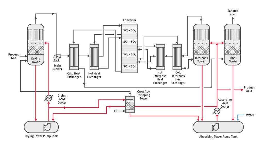连续或半连续冶金工艺产出的废气中基本都包含二氧化硫气体,将这种废气送入MECS®一级动力波®逆喷洗涤器中,通过利用循环稀酸洗涤,并冷却到绝热饱和温度。之后,再将烟气送入MECS® ZeCor®高效冷却塔中进行冷却,使水分含量降至生产产品酸时的所需水量。根据进料气体中杂质含量的大小而定,可能还会通过二级动力波®逆喷洗涤器。最后一道烟气净化工序是将烟气送入MECS®电除雾,以去除液体和固体颗粒物,以防硫酸装置发生腐蚀和堵塞。然后,再将气体送入ZeCor®高效干燥塔,清除过余水蒸气。采用MECS®布林克®除雾器高效清除酸雾,以保护主风机。最后将干燥、清洁的烟气经过压缩后送入转化器系统。